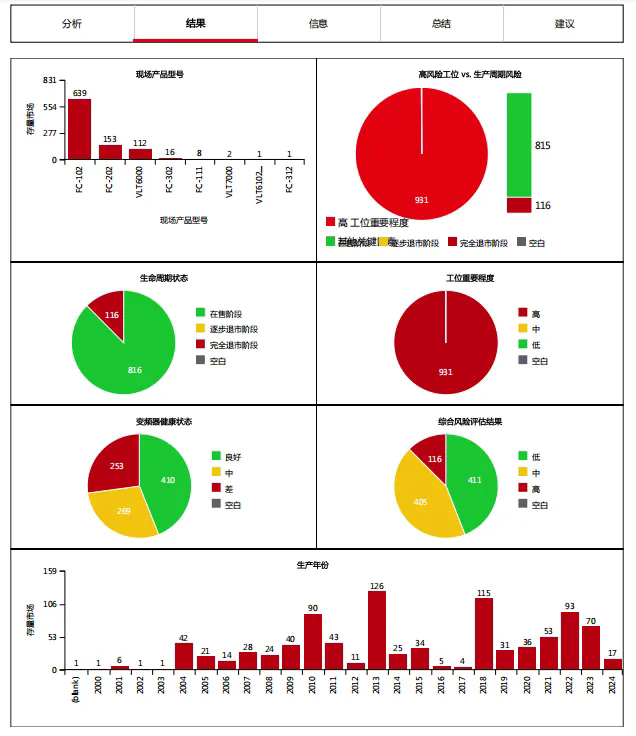 丹佛斯工程師帶領(lǐng)團(tuán)隊(duì),現(xiàn)場推進(jìn)評(píng)估工作。依據(jù)現(xiàn)場評(píng)估所獲取的數(shù)據(jù)信息可知,當(dāng)前該熱力公司在用的變頻器以丹佛斯FC102和FC202機(jī)型為主,有少量FC302和FC111機(jī)型,其中112臺(tái)已退市的VLT6000機(jī)型仍在使用,445臺(tái)變頻器已使用超過10年,253臺(tái)變頻器健康狀態(tài)較差。此次現(xiàn)場評(píng)估工作從變頻器健康狀態(tài)、生命周期、工位重要程度三個(gè)維度進(jìn)行了分析,幫助客戶梳理變頻器臺(tái)賬,排查故障,為后續(xù)的設(shè)備維保改造與預(yù)算制定計(jì)劃提供了依據(jù)。