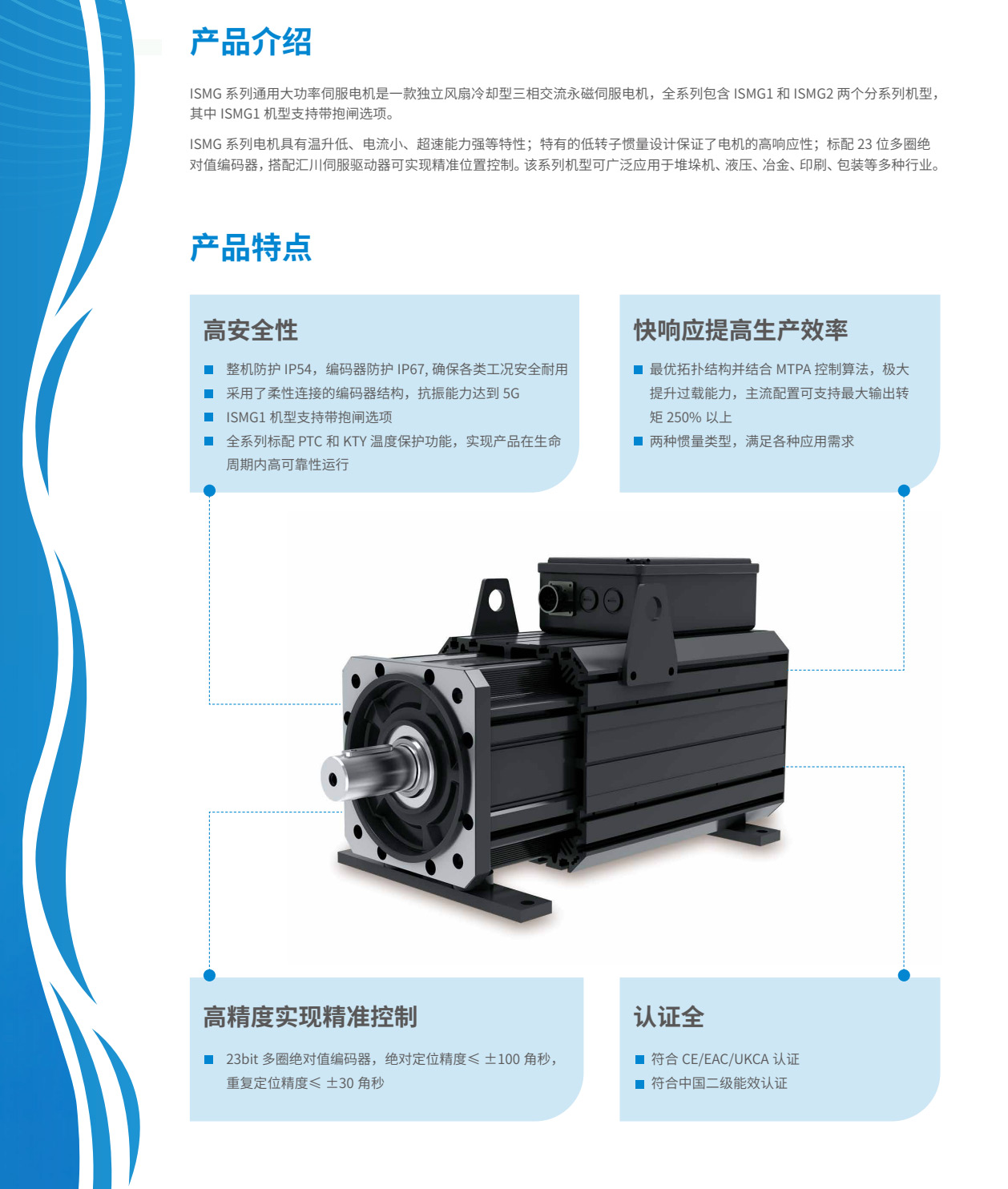 ISMG系列伺服電機產(chǎn)品,功率覆蓋7.5 kW ~ 80 kW、標配23 位絕對值編碼器;產(chǎn)品的IP54 防護等級設(shè)計、耐沖擊振動的編碼器結(jié)構(gòu)設(shè)計保證了產(chǎn)品可以覆蓋絕大多數(shù)工業(yè)場合的應(yīng)用;獨特的電磁設(shè)計及風冷回路設(shè)計、內(nèi)置熱保護器,實現(xiàn)了產(chǎn)品在生命周期內(nèi)高可靠性運行;ISMG1系列亦可加裝150 N·m 制動扭矩的制動器。